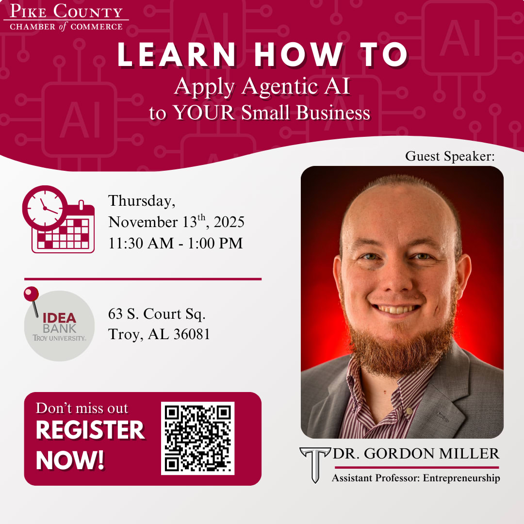 Artificial intelligence isn’t just for big corporations—it’s becoming a powerful, practical tool that small businesses can use right now to save time, cut costs, and create new opportunities. In this session, Dr. Gordon Miller will show you how agentic AI—a new wave of AI that can act on your behalf, not just give answers—can streamline operations, improve customer engagement, and open up new ways of doing business. Whether you’re curious about AI or ready to put it to work, this event will give you actionable insights and practical examples tailored for small business owners. Come learn how to make AI your business partner instead of just a buzzword! About the speaker: Dr. William Gordon Miller is the Assistant Professor of Entrepreneurship at Troy University and holds degrees in Music Education (BS, Troy University), Economics (MA, Troy University), and Entrepreneurship (PhD, Baylor University). Before joining the faculty at Troy, he was the Assistant Professor of Management at Kings College in Northeast Pennsylvania (NEPA). He specializes in the intersection of entrepreneurship, technology, and strategy, focusing on how emerging tools like artificial intelligence can empower business owners to work smarter, not harder. Thursday, November 13th 11:30 am - 1:00 pm Troy University IDEA Bank 63 S Court Sq Troy, AL 36081
