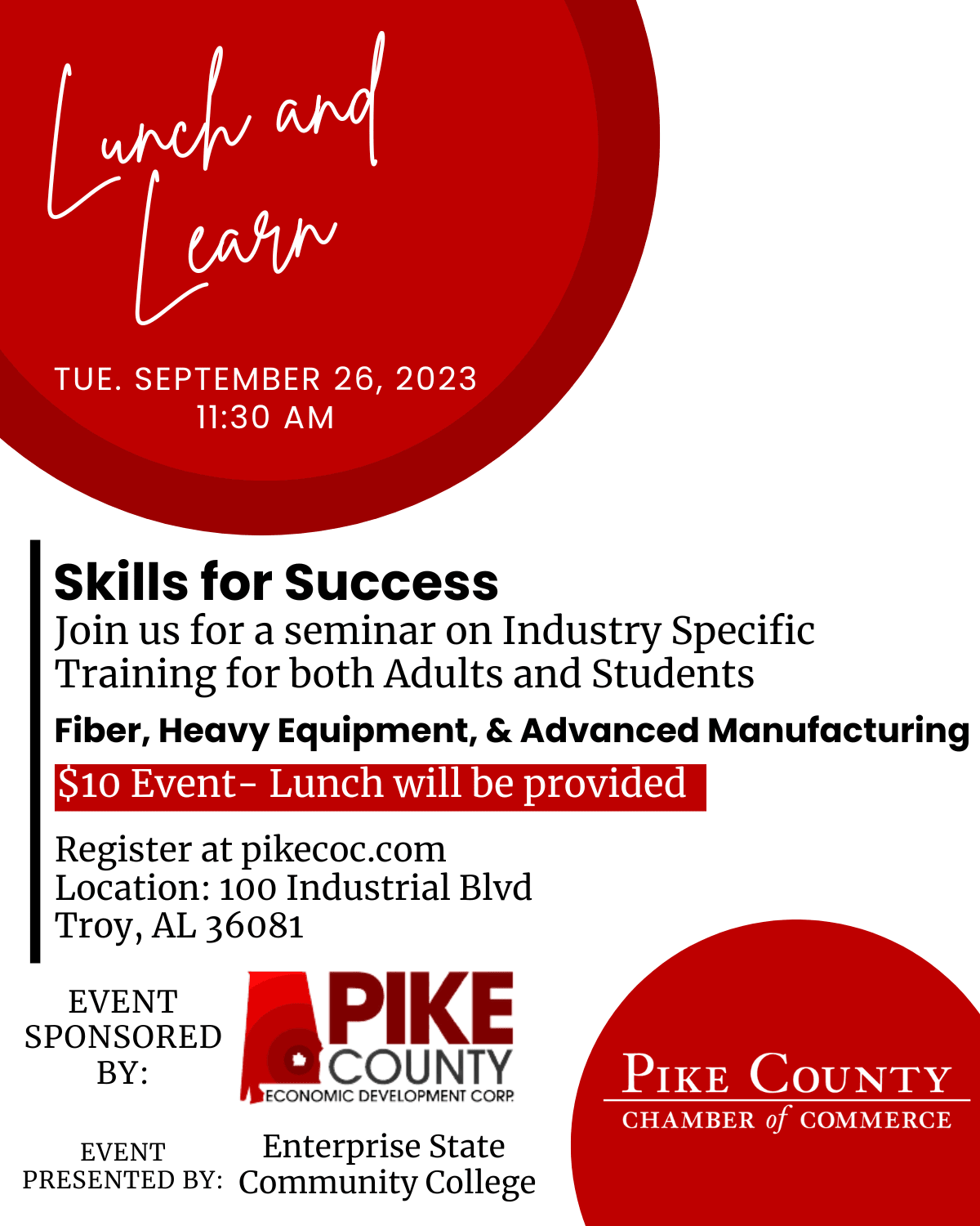 Join us for a seminar on Industry Specific training for both Adults and Students. Enterprise State Community College will be presenting on Fiber, Heavy Equipment, and Advanced Manufacturing. This event is $10 and lunch will be provided.