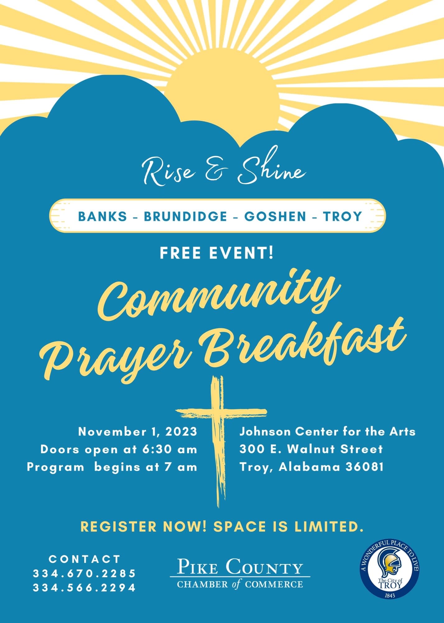 Join us for a Community Prayer Breakfast! Doors open at 6:30am and the program will start at 7am.