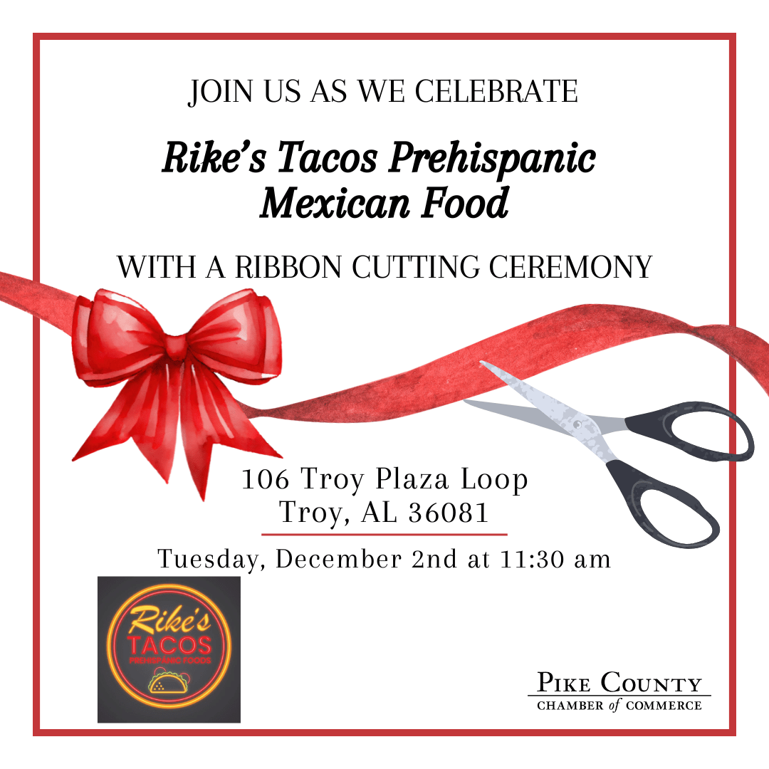Join us as we celebrate the re-grand opening of Rike’s Taco Prehispanic Mexican Food with a ribbon cutting ceremony! ✂️🌮 Event Details: 📅 Tuesday, December 2nd ⏰ 11:30 AM 📍 106 Troy Plaza Loop, Troy, AL 36081Images